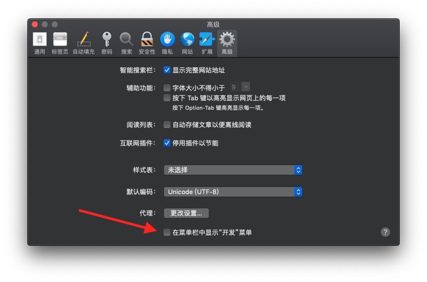 Safari的设置,找到高级,勾选在菜单栏中显示“开发”菜单,如图: