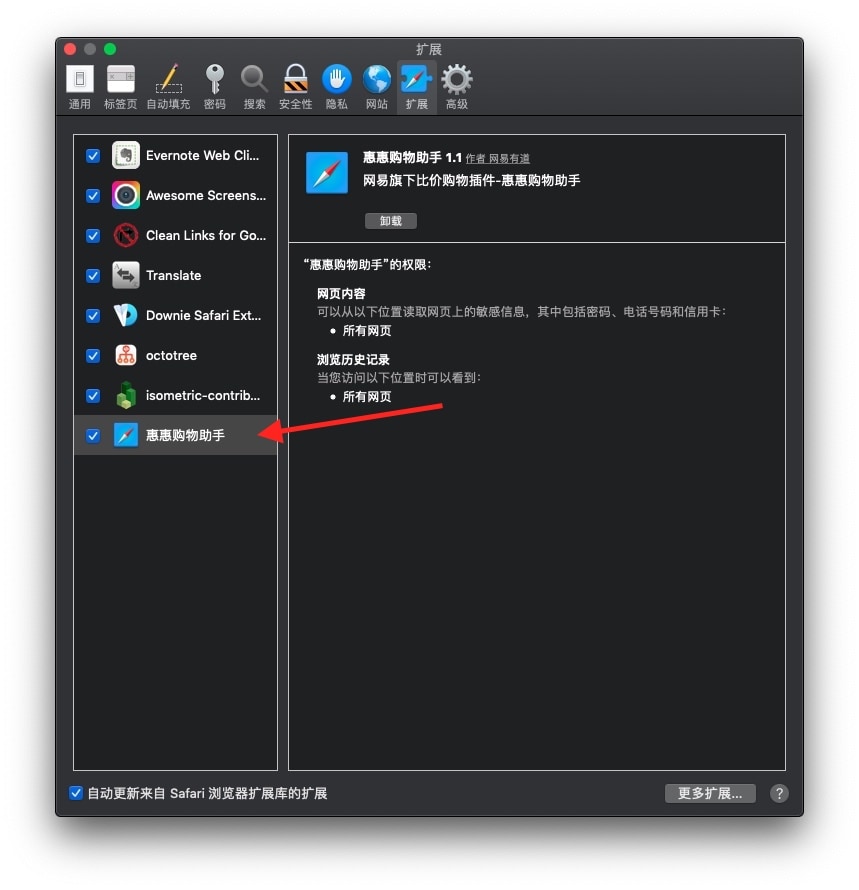 Safari的设置中,就可以看到惠惠购物助手已经安装完毕了: