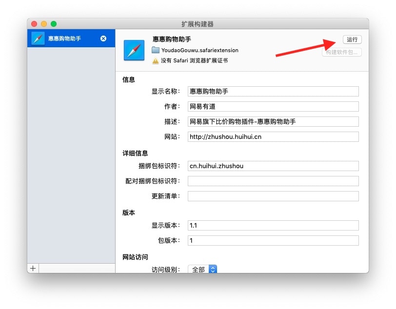 扩展构建器中看到惠惠购物助手了,然后点击右上角的运行,如图:
