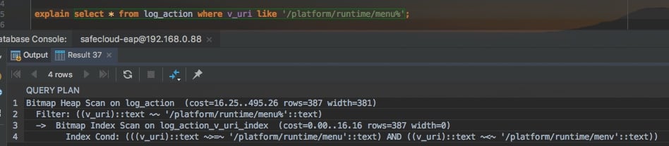 上一篇中,我们学习了PostgreSQL中想要让varchar类型支持like查询能够命中索引,需要注意的地方。但是即便是创建索引时,指定了操作符类varchar_pattern_ops,在使用like查询的时候,还是只能保证sometext%这种查询能够命中索引,但是%sometext这种是无能为力的,见下图。